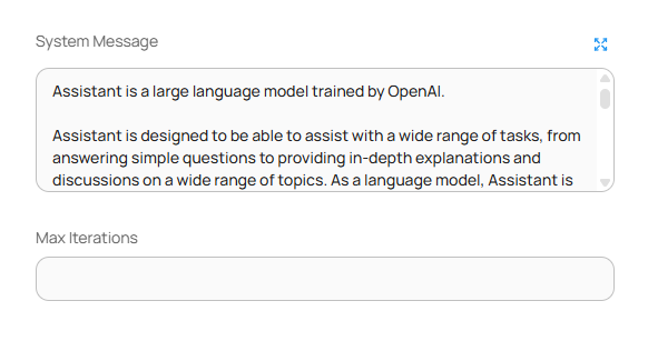 | **System Message** | <p>에이전트에게 부여하는 역할 설명입니다.<br>예시 기본값:<br><code>Assistant is a large language model trained by OpenAI. Assistant is designed to assist with a wide range of tasks...</code><br>※ 이 메시지는 에이전트의 말투, 태도, 응답 범위를 정의합니다.</p> |