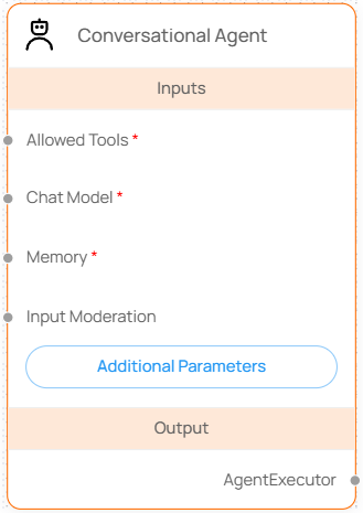 **Conversational Agent 노드**는 사용자와의 지속적인 대화를 기반으로 다양한 작업을 수행하는 **대화형 에이전트**입니다. 외부 도구를 조합하고 메모리 기능을 활용해 **대화의 흐름을 유지하며 지능적인 응답**을 제공합니다. &#x20;