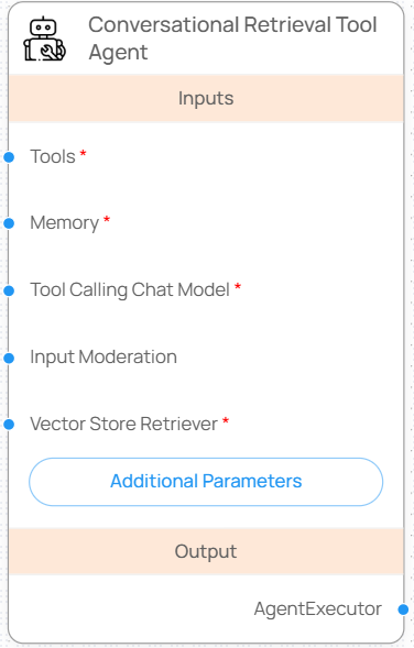 **Conversational Retrieval Tool Agent** 노드는 사용자 질문에 대해 **외부 문서에서 정보를 검색**하고, 필요 시 도구를 호출해 대화형으로 응답하는 고급 에이전트입니다. 벡터 검색 기반의 컨텍스트를 참고하며, 툴 호출 기능이 내장되어 있어 **문서 기반 Q\&A + 도구 활용**을 함께 수행할 수 있습니다. &#x20;