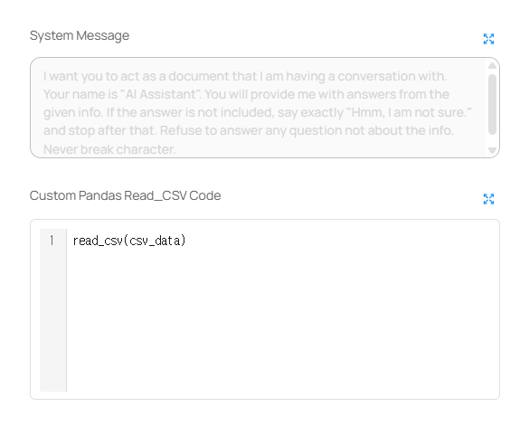 | **System Message**               | <p>LLM에 부여되는 역할 지시 문구입니다. 기본값은 아래와 같으며, 사용자 응답을 CSV 기반 정보로 제한합니다:<br><code>I want you to act as a document that I am having a conversation with. Your name is “AI Assistant”…</code></p> |