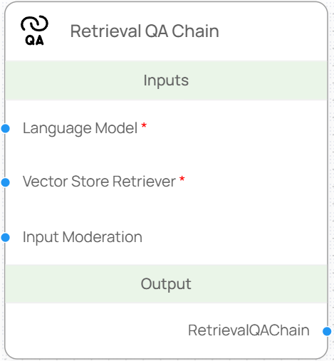 **Retrieval QA Chain** 노드는 사용자 질문에 대해 벡터스토어 기반 문서를 검색하고, 해당 결과를 바탕으로 언어 모델이 응답을 생성하는 질의응답용 체인입니다.\