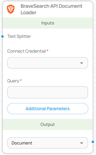 Brave Search API를 통해 실시간 웹 검색 결과를 수집하고, 해당 결과를 문서(Document) 형식으로 변환하는 로더 노드입니다. 최신 정보를 기반으로 하는 AI 파이프라인이나 검색 기반 QA에 활용됩니다.