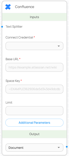 Atlassian Confluence에서 특정 Space의 콘텐츠를 불러와 문서(Document) 형식으로 변환하는 로더 노드입니다. 팀 위키, 정책 문서, 기술 매뉴얼 등 다양한 협업 지식을 LLM 기반 파이프라인에서 재활용할 수 있습니다.