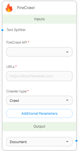 웹 페이지 또는 다수의 하위 페이지를 크롤링하여 텍스트 콘텐츠를 문서 형식으로 추출하는 노드입니다. Flowise와 연동되는 FireCrawl API를 활용하며, 크롤링 범위와 필터 조건을 자유롭게 설정할 수 있습니다.