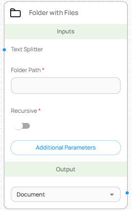지정한 폴더 경로 내의 모든 문서를 불러와 하나의 파이프라인에서 처리할 수 있도록 도와주는 노드입니다. PDF, JSONL, 텍스트, Word 등 다양한 포맷의 파일을 동시에 로드할 수 있으며, 하위 폴더 포함 여부도 설정할 수 있습니다.