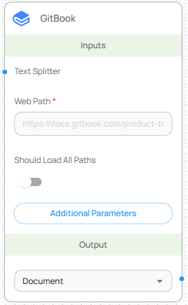 GitBook 노드는 지정한 GitBook 문서의 웹 경로를 입력하면 해당 페이지의 콘텐츠를 자동으로 불러와 문서 데이터로 변환합니다. 문서 기반 RAG 파이프라인 구축 시, 최신 온라인 매뉴얼이나 기술 문서를 불러오는 데 적합합니다.&#x20;