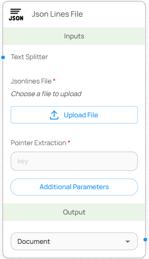Json Lines File 노드는 `.jsonl` 형식의 파일을 업로드하여 각 줄별 JSON 객체를 문서 객체(Document)로 변환합니다. 로그, 크롤링 결과, 사용자 이벤트 기록 등 대용량 스트리밍 데이터를 AI 파이프라인에서 활용하기 적합합니다.