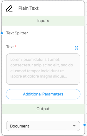 Plain Text 노드는 사용자가 입력한 순수 텍스트 데이터를 문서 객체(Document)로 변환합니다. 문서 파일 없이도 간단한 텍스트 콘텐츠를 직접 입력하여 RAG 또는 분석 파이프라인에 활용할 수 있습니다.