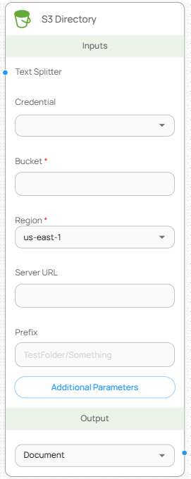 S3 Directory 노드는 Amazon S3 버킷의 특정 경로(디렉토리) 내 파일들을 불러와 문서 객체(Document)로 일괄 변환합니다. 다수의 문서 파일을 정기적으로 불러와 자동 처리하거나 분석 파이프라인에 투입하는 데 적합합니다.
