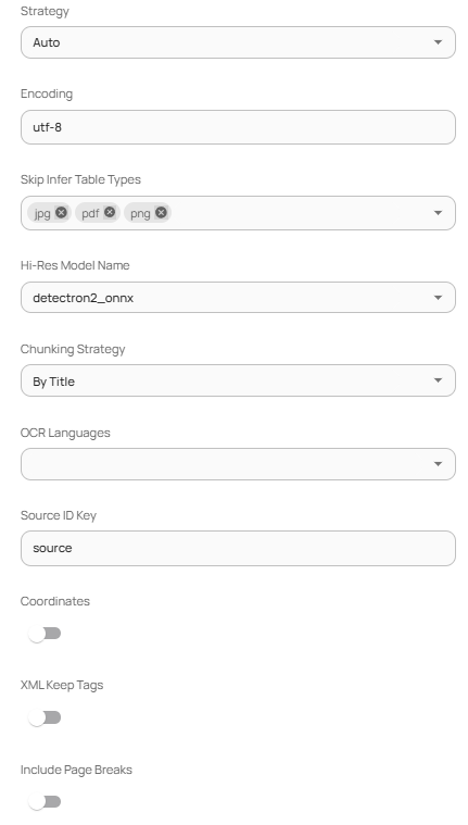 | Strategy               | 문서 추출 전략 (Auto, Hi-Res, Fast 등)       |