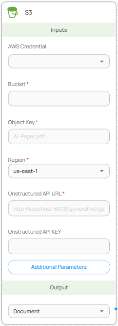 S3 노드는 Amazon S3에 저장된 단일 파일을 Unstructured API와 연동하여 텍스트로 변환하고, 문서 객체(Document)로 출력합니다. OCR, 레이아웃 분석, Chunking 등 고급 전처리 옵션을 활용하여 정교한 문서 파싱이 가능합니다.