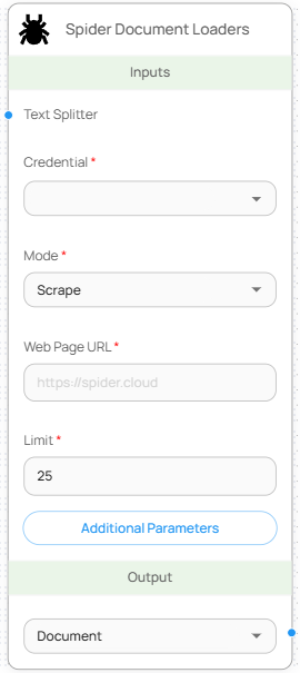 | Additional Parameters | Spider API 호출 시 사용할 추가 파라미터 (예: 필터, CSS selector 등) |