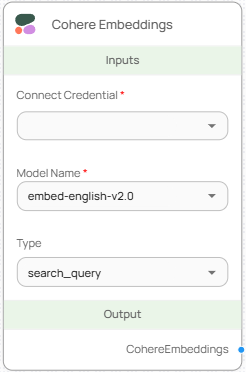 Cohere Embeddings 노드는 Cohere에서 제공하는 고성능 임베딩 모델을 사용하여 텍스트 데이터를 벡터로 변환합니다. 사용 목적에 따라 임베딩 방식(Type)을 설정할 수 있어 검색, 분류, 군집화 등 다양한 AI 파이프라인에 적합합니다.
