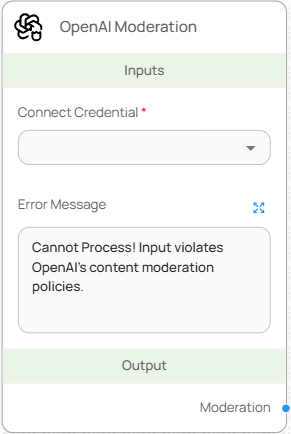OpenAI Moderation 노드는 OpenAI의 콘텐츠 모더레이션 API를 호출하여 입력된 문장의 정책 위반 여부를 자동으로 검사하는 기능을 제공합니다. 사용자의 입력값이 민감하거나 부적절할 수 있는 경우, 사전 필터링을 위한 전처리 용도로 활용됩니다.