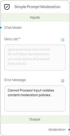 Simple Prompt Moderation 노드는 사전에 정의된 Deny List 기반으로 사용자 입력에 포함된 금지 표현을 탐지하여, 특정 조건을 만족할 경우 실행을 차단하는 간단한 프롬프트 검열 노드입니다. 외부 API 호출 없이 빠르고 경량화된 필터링을 제공합니다.