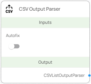 CSV Output Parser 노드는 LLM 또는 Agent의 응답 결과를 CSV 형식의 리스트로 자동 변환하는 파서 노드입니다. 응답이 잘못된 형식으로 출력되더라도 AutoFix 기능을 통해 CSV 구조를 보정할 수 있습니다.