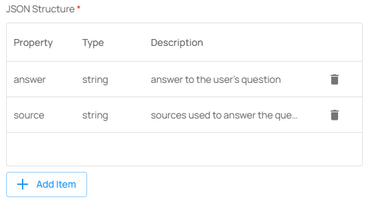 | JSON Structure | <p>파싱 결과가 따라야 할 JSON 스키마 (속성명, 타입, 설명 포함)<br>예: <code>answer</code>, <code>source</code> 등의 필드 정의 가능</p> |